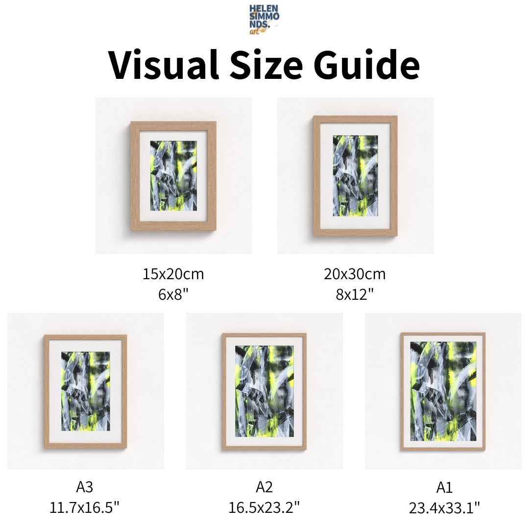 A giclée fine art paper print made from an original artwork. It comes in sizes 6"x8", 8"x12", A3 (11.7"x16.5"), A2 (16.5"x23.2") and A1 (23.4"x33.1"). Please see graphic for visual size variations. Due to the dimensions of each size offered, the artwork will look slightly different.