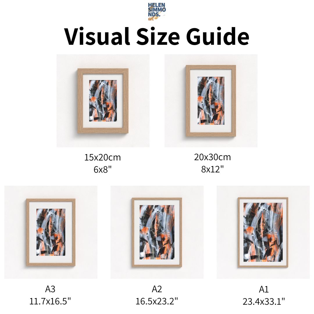 A giclée fine art paper print made from an original artwork. It comes in sizes 6"x8", 8"x12", A3 (11.7"x16.5"), A2 (16.5"x23.2") and A1 (23.4"x33.1"). Please see graphic for visual size variations. Due to the dimensions of each size offered, the artwork will look slightly different.